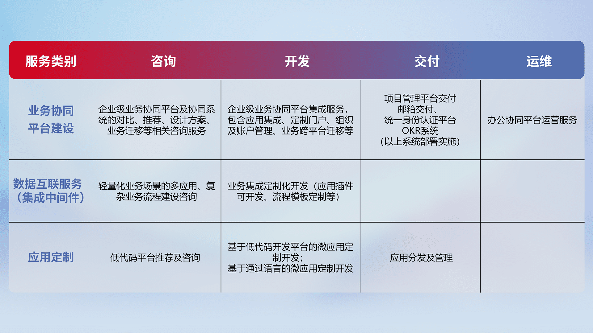 针对钉钉、、、、企微、、IDaas等平台级产品提供产品的规划、、方案、、交付、、定制化开发等服务,,实现如统一协同办公、、智能客户服务、、、混合会议管理、、智能数据查询、、等业务场景,,实现数字化转型。。。。